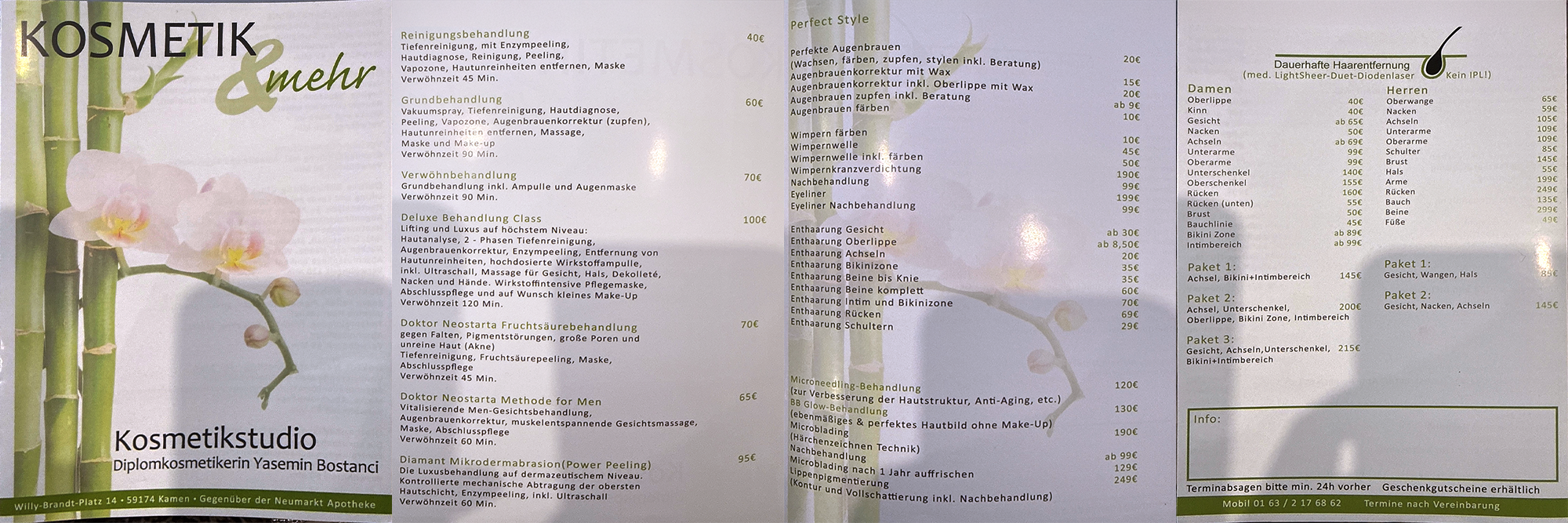 Am Willy-Brandt-Platz in Kamen ist unser Kosmetikstudio eine zentral gelegene Oase. Gönnen Sie sich eine verwöhnende Auszeit vom durchaus hektischen Alltag. Bei einer tiefenreinigenden Gesichtspflege können Frau und Mann entspannen. Neben dezenten Tages-Make-ups bieten wir Wimpernfärben und weitere Beauty-Anwendungen an, sodass Sie uns mit einem Perfect-Style verlassen.